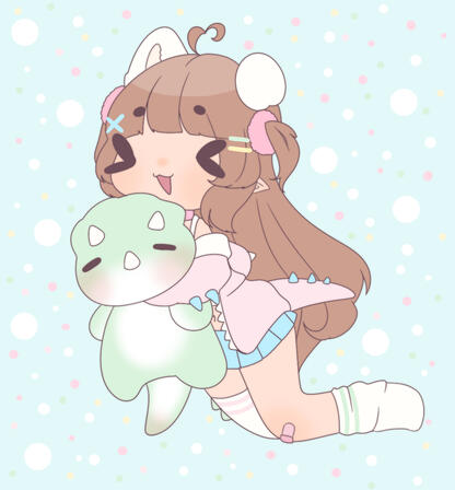 only sfw art of cinna is allowed!! cinna has a small, petite body and a flat chest. she has a chubby belly and squishy thighs although a thinner body type is fine too. she is 3'6" (110 cm)! her hair is usually messy and her hair accessories can be changed. she loves pastel rainbow colors (especially pink/light red, yellow, green, and blue), plushies, baby items, puppy themes, toys, dinosaurs, and cute things. cinna is a shy but playful puppy and loves pretending to be a dinosaur!
