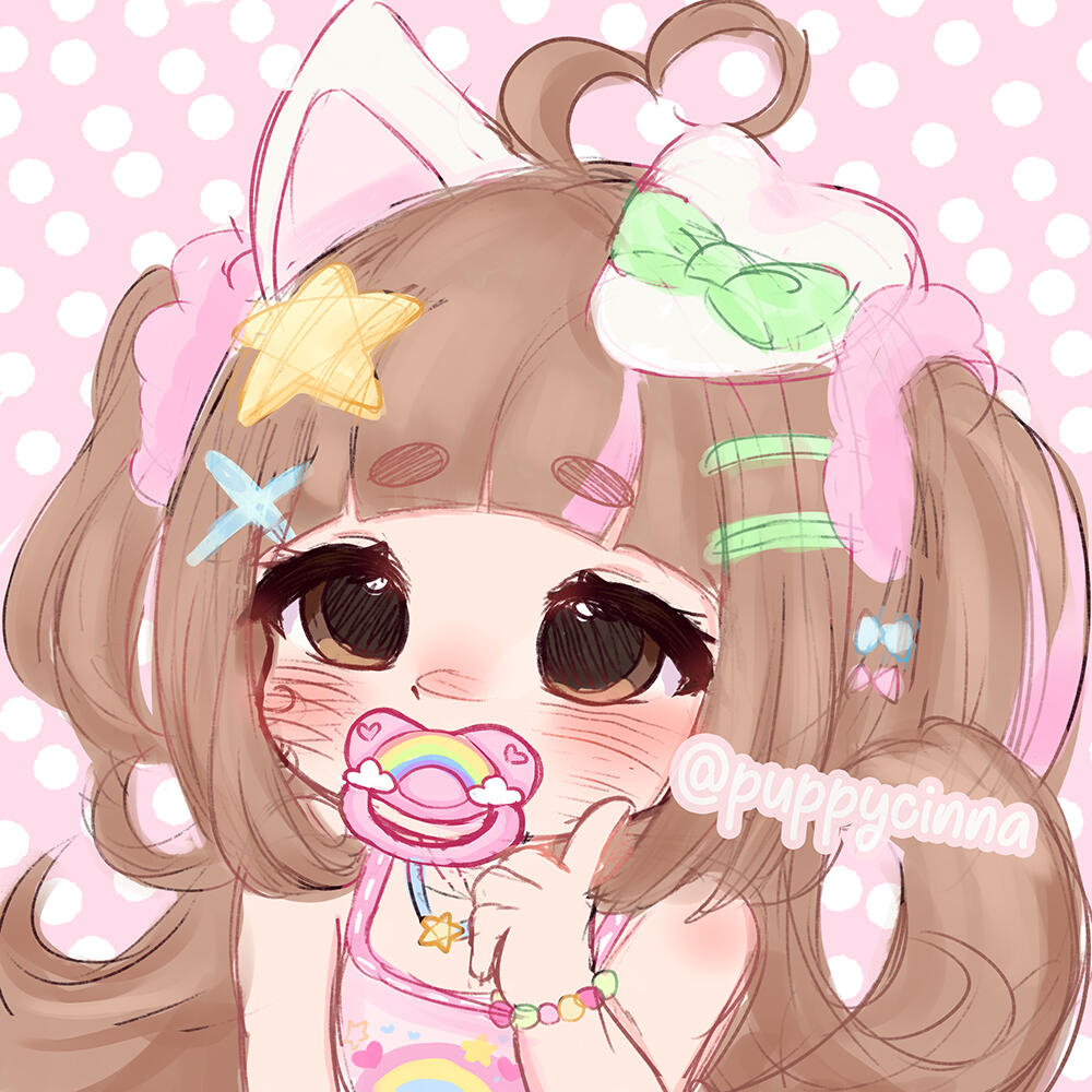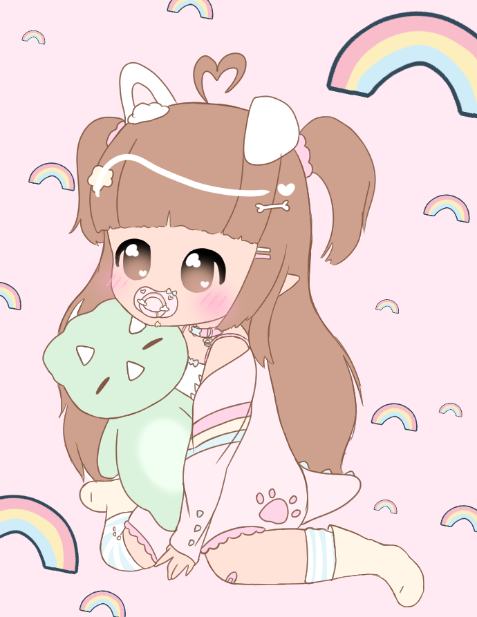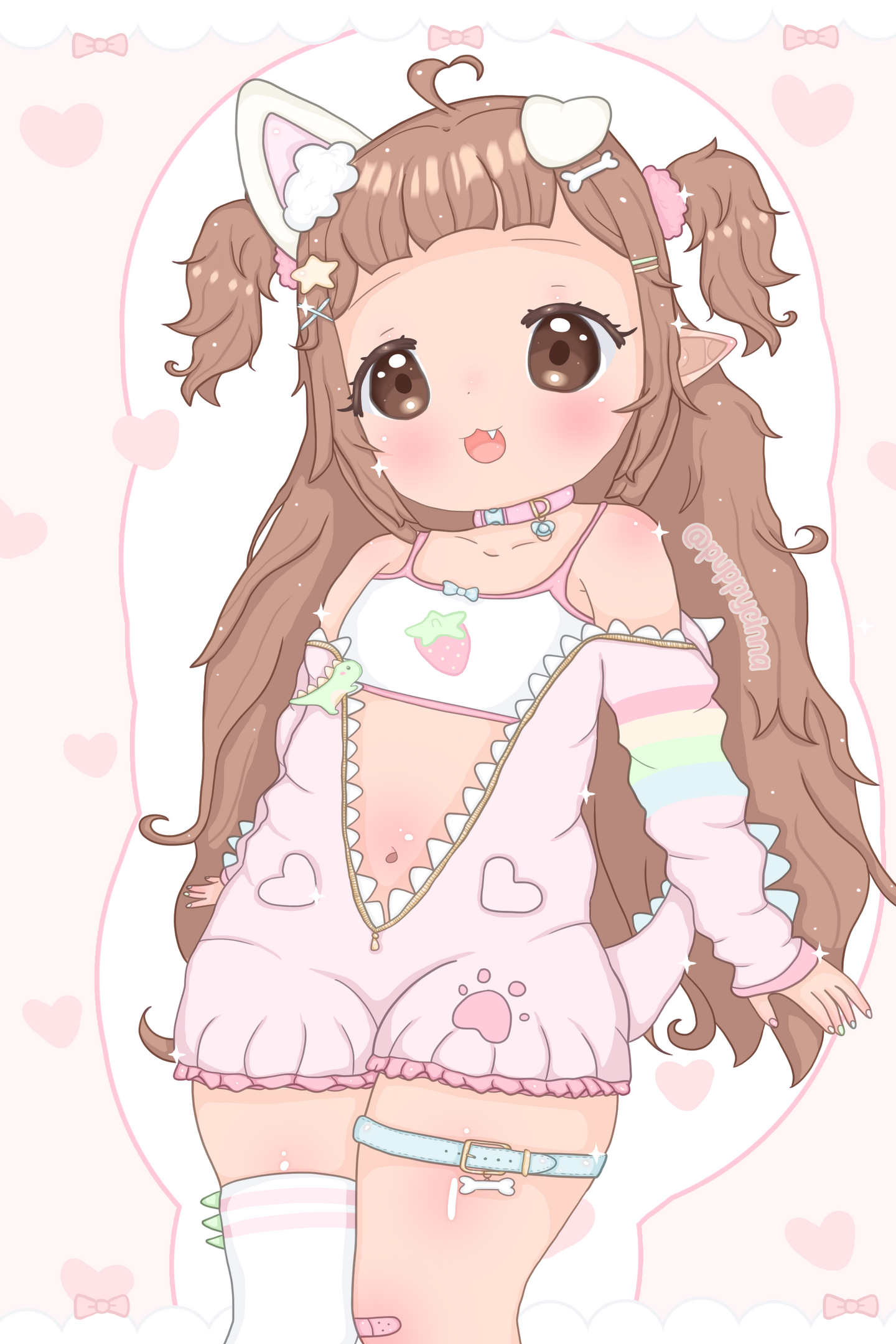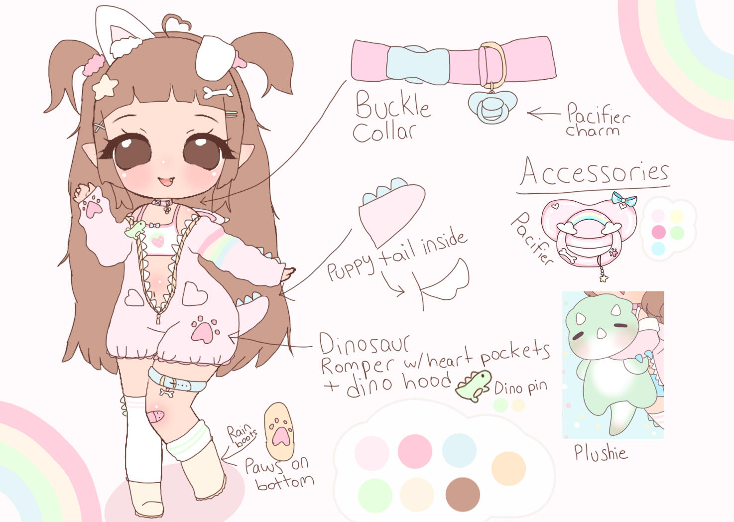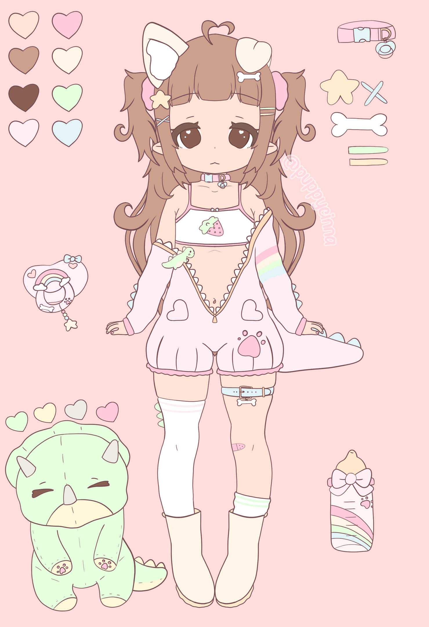 only sfw art of cinna is allowed!! cinna has a small, petite body and a flat chest. she has a chubby belly and squishy thighs although a thinner body type is fine too. she is 3'6" (110 cm)! her hair is usually messy and her hair accessories can be changed. she loves pastel rainbow colors (especially pink/light red, yellow, green, and blue), plushies, baby items, puppy themes, toys, dinosaurs, and cute things. cinna is a shy but playful puppy and loves pretending to be a dinosaur!